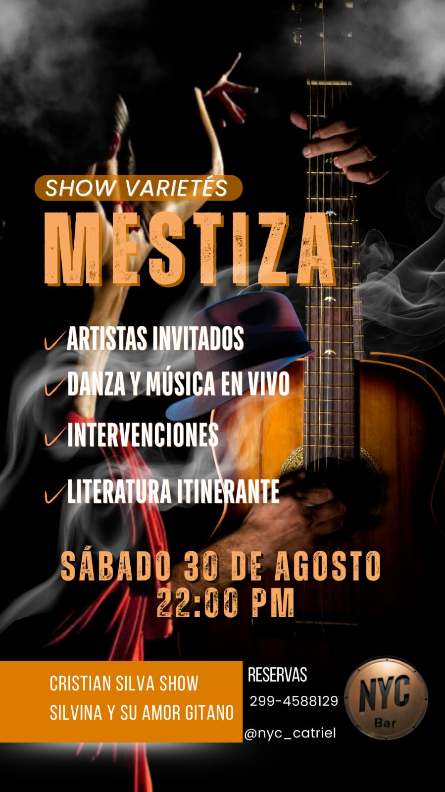 El próximo sábado 30 de agosto a las 22 horas, el Bar NYC será escenario de una nueva edición de Mestiza, el ciclo de varietés que viene reuniendo música, danza y literatura en Catriel.