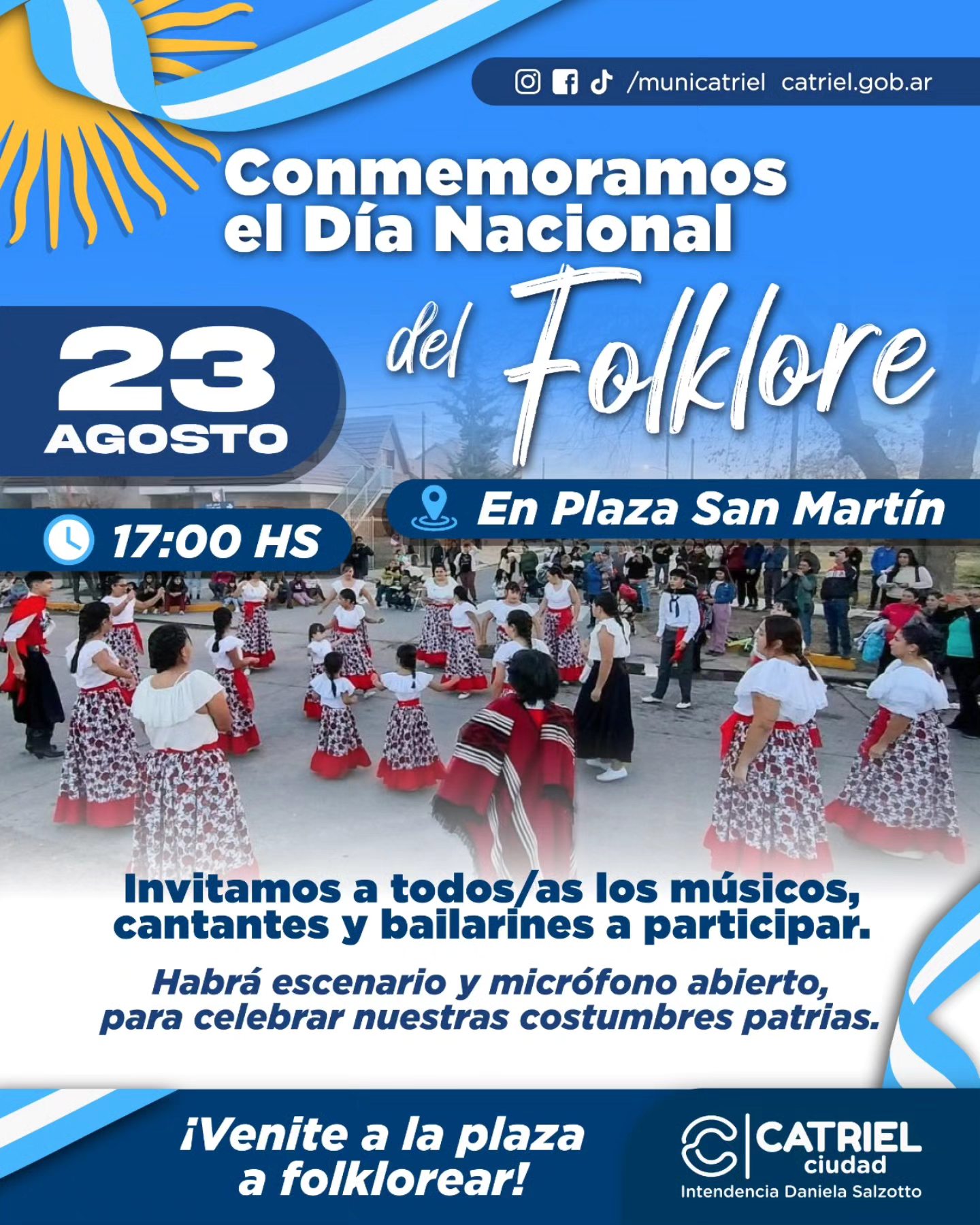 Catriel se prepara para vivir una tarde de música, danza y tradición. Este sábado 23 de agosto, la Plaza San Martín será el escenario central del festejo por el Día Nacional del Folklore, organizado por el área de Cultura de la Municipalidad.