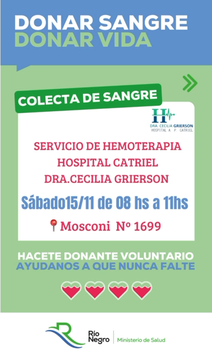 El Hospital Dra. Cecilia Grierson convocó a vecinos y vecinas de Catriel a participar de una nueva colecta de sangre organizada por el Servicio de Hemoterapia. La actividad se llevará a cabo este sábado 15 de noviembre, de 08:00 a 11:00, en la sede ubicada en Mosconi Nº 1699.