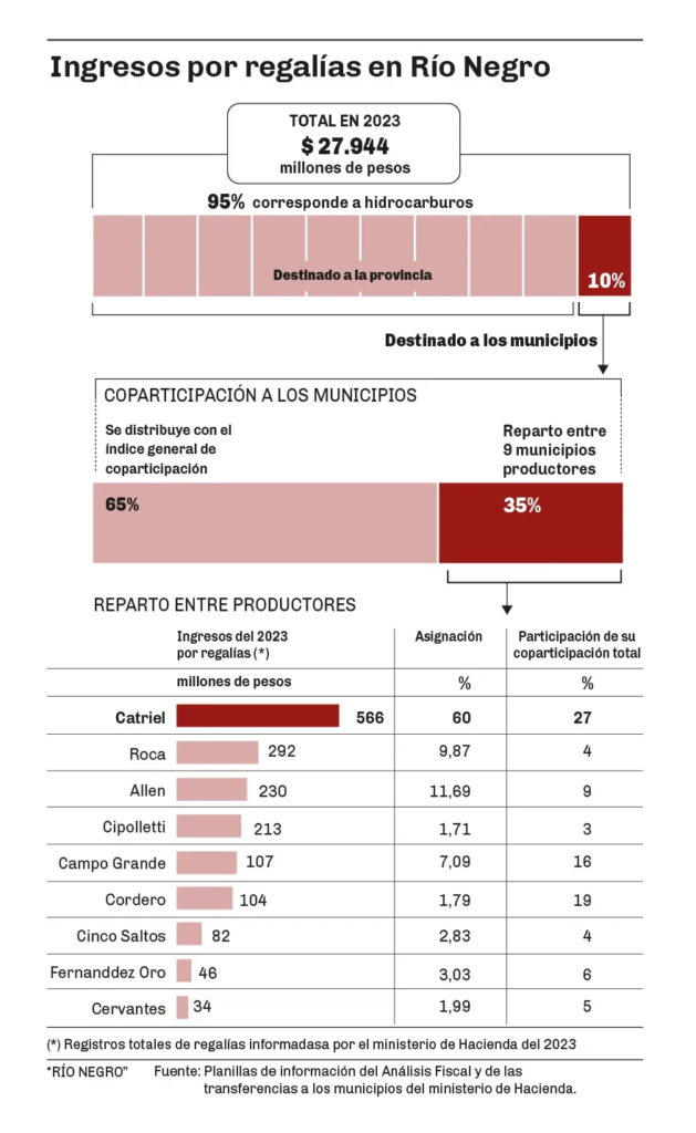 Crecen las disputas en Río Negro por la distribución de regalías en la antesala de la renegociación de los contratos petroleros. Los municipios recibieron 2.500 millones de pesos en el primer cuatrimestre del año por su parte de los ingresos provinciales provenientes de regalías, la mayoría de las cuales provienen de la explotación de áreas hidrocarburíferas. Según la Ley 1946, un 10% de estos ingresos se distribuye entre los 39 municipios.