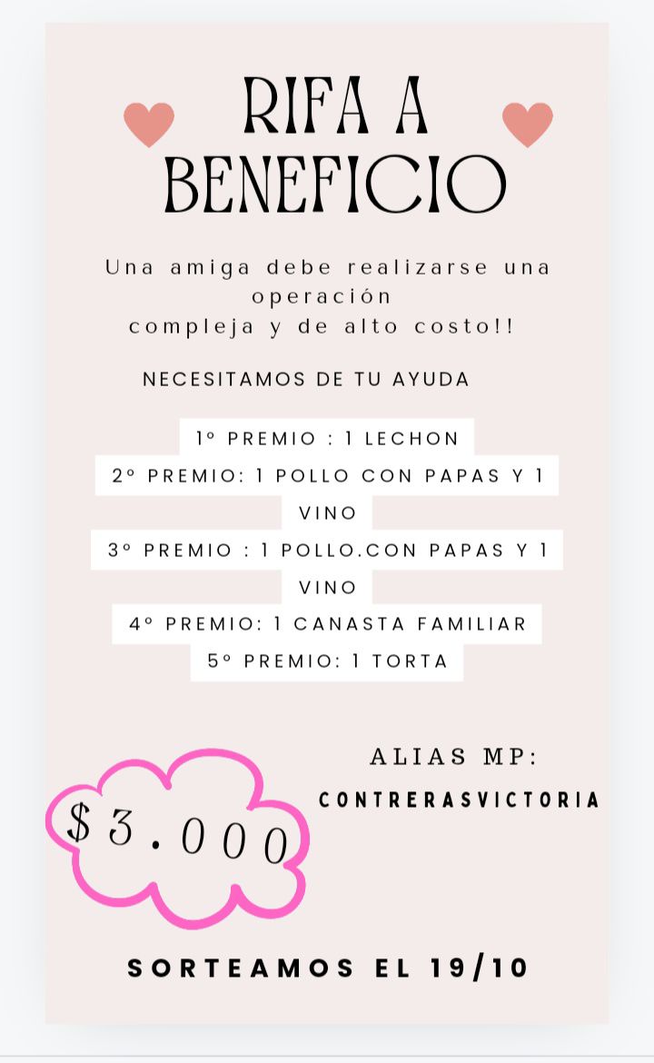 El valor de cada número de la rifa es de $3000 y el sorteo se realizará el próximo 19 de octubre. Quienes deseen colaborar, pueden hacerlo adquiriendo un número o realizando un aporte voluntario a través del alias de Mercado Pago: Contrerasvictoria.