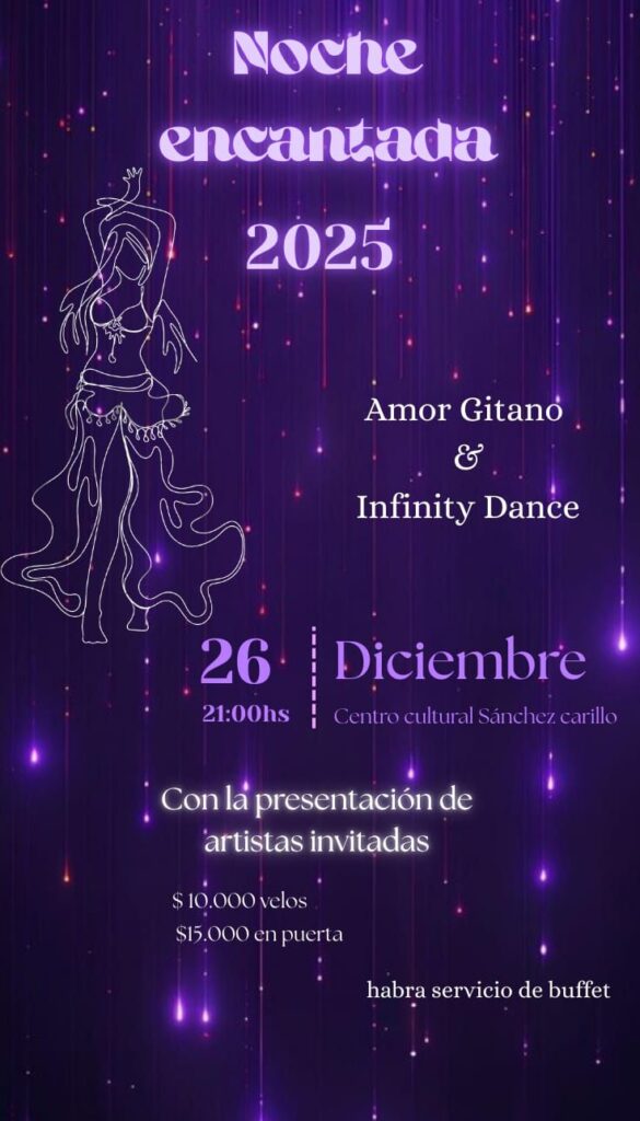 El 26 de diciembre, a las 21 horas, el Centro Cultural de la ciudad será sede de una nueva edición de “Noche Encantada”, un evento artístico que reunirá presentaciones de bailarinas, odaliscas y diversas academias invitadas. La actividad fue confirmada por las organizadoras del encuentro, Silvina y Brenda, quienes además se encuentran a cargo del sistema de reservas.