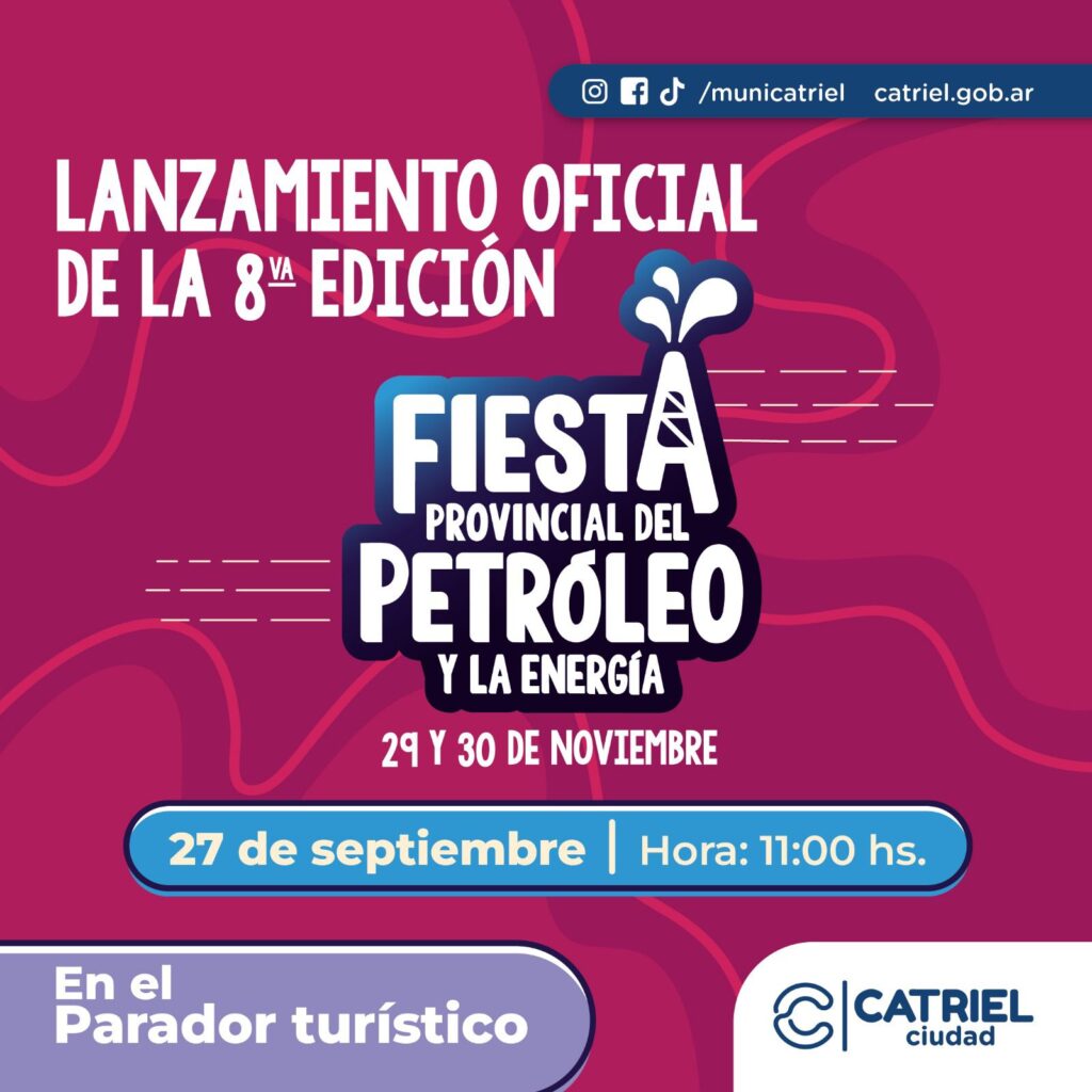 Mañana, 27 de septiembre, a las 11 horas en el parador de Turismo sobre la Ruta Nacional 151, se realizará la presentación oficial de la 8va edición de la Fiesta del Petróleo, ahora renombrada como «Fiesta del Petróleo y la Energía». Esta será la primera edición organizada por la gestión de la intendenta Daniela Salzotto y se celebrará los días 29 y 30 de noviembre.