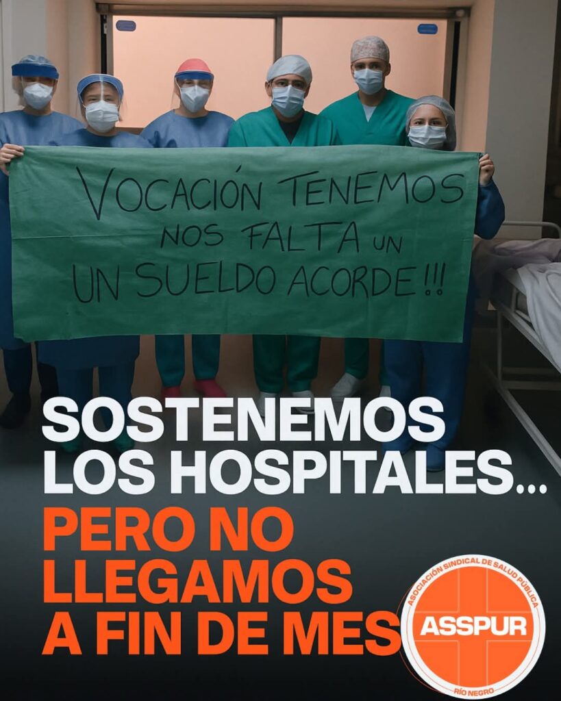 La crisis salarial en el sistema de salud rionegrino volvió a quedar en evidencia con la difusión de un reclamo de profesionales y técnicos nucleados en ASSPUR (Asociación Sindical de Salud Pública de Río Negro). “Sostenemos los hospitales, pero no llegamos a fin de mes”, señalan en una campaña que se replica en distintos centros de atención de la provincia.
