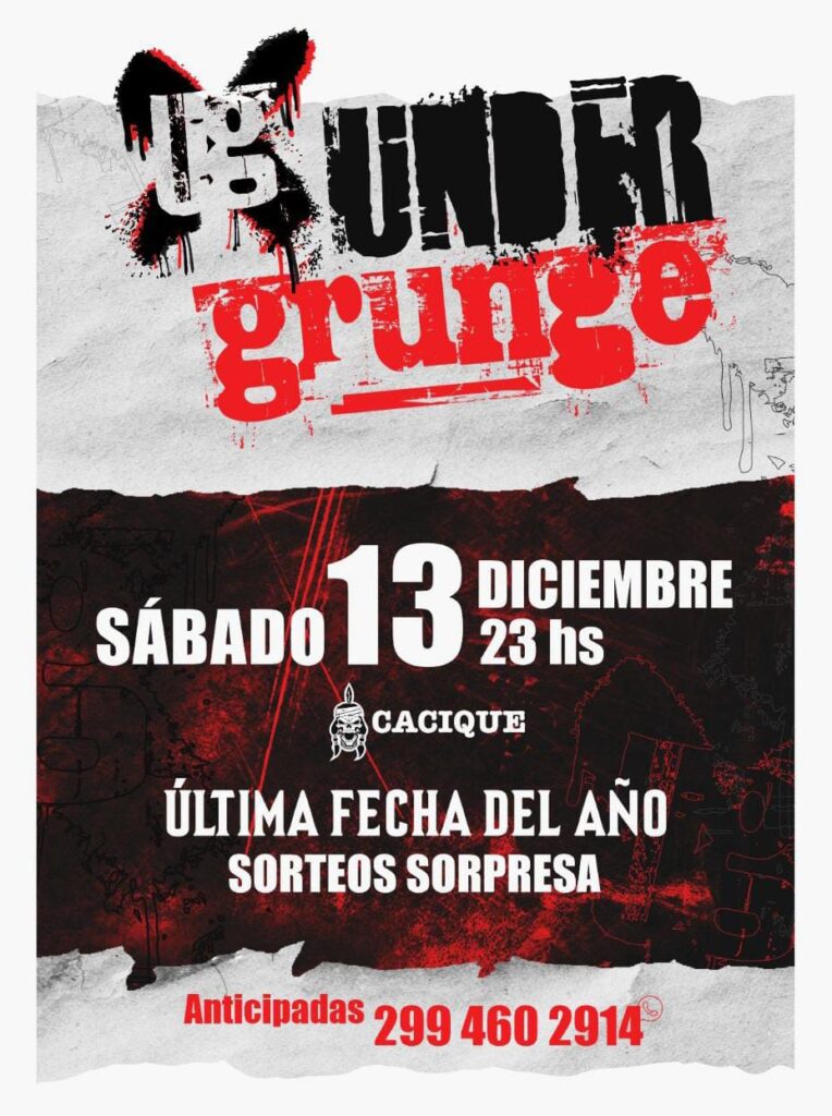 La banda Under Grunge realizará este sábado 13, desde las 23 horas, una tocata en Cervecería Cacique (barrio Lote 6), en lo que será su última presentación del año. El recital incluirá premios sorpresa y forma parte de la agenda cultural nocturna de la ciudad, con una propuesta orientada al rock alternativo y al grunge.